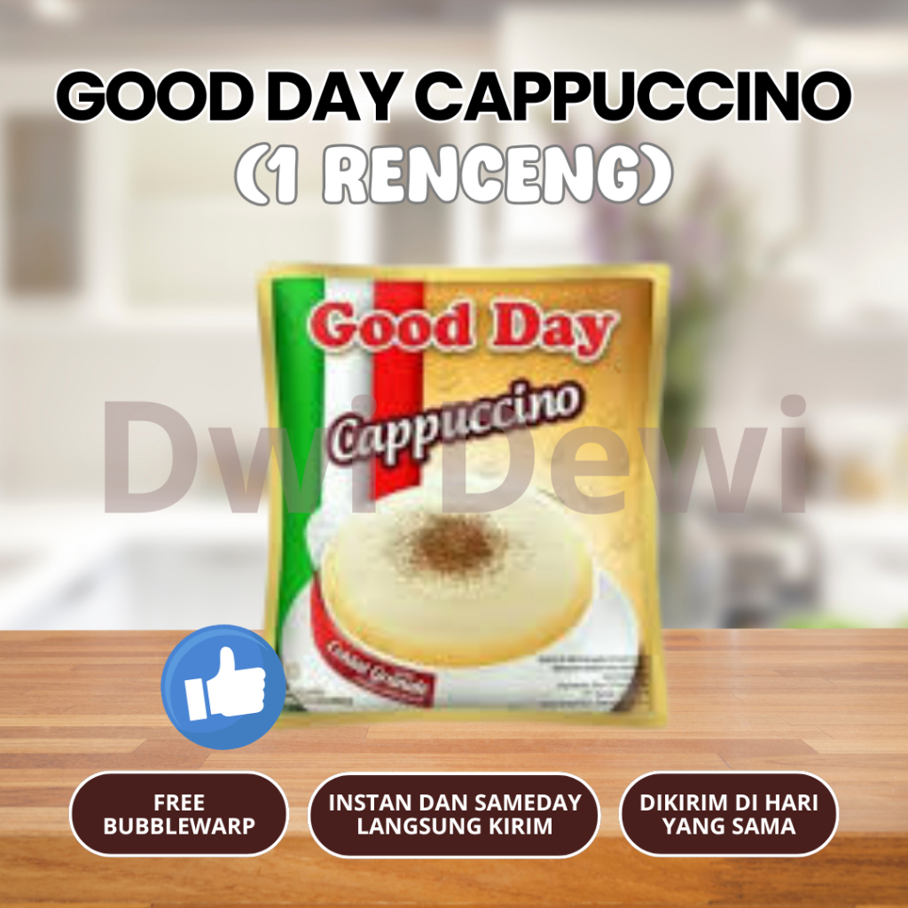 Nikmati sensasi lembut dan creamy dari Good Day Cappuccino, minuman kopi instan yang dipadukan dengan krimer dan taburan cokelat bubuk di setiap sachetnya. Rasanya pas, aromanya menggoda, cocok banget buat teman santai atau kerja!