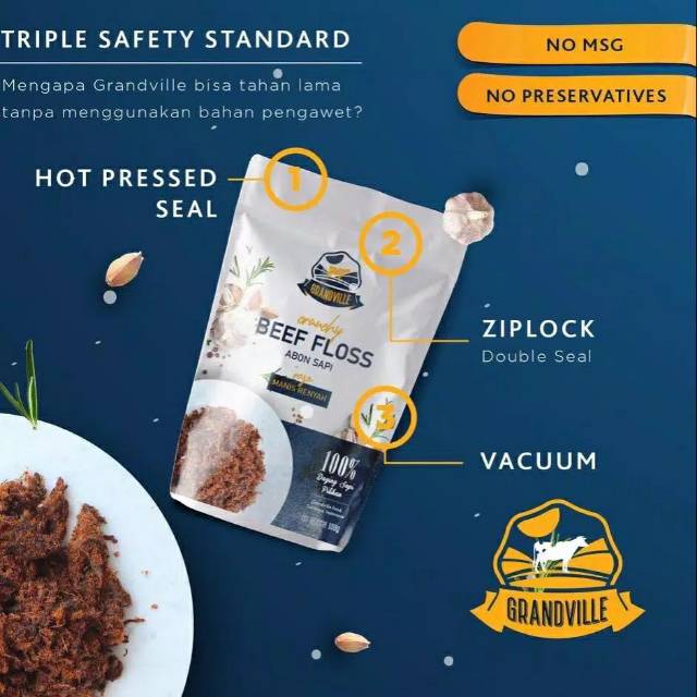 - Grandville abon melalui proses pengeringan maksimal sehingga minim minyak yang tersisa, selain itu Grandville abon diolah menggunakan vacum dan packaging double seal.