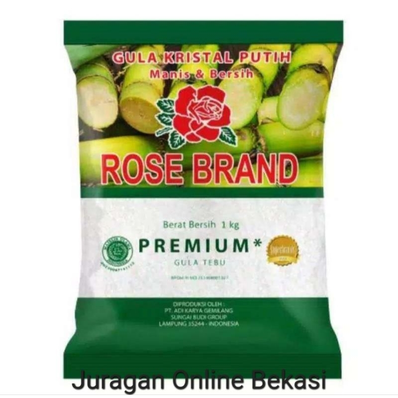 gula rosebrand premium kemasan 1 kg warna hijau terbuat dari tebu pilihan yang diolah secara higienis