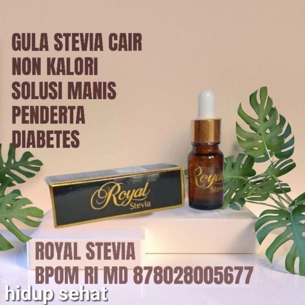 Royal stevia adalah gula cair yang terbuat dari daun stevia. Daun stevia dikenal sebagai bahan alami yang baik untuk penderita diabetes karena rendah kalori. Setiap tetes Royal stevia sama dengan 3 sendok gula atau 1 tetes sama dengan 4 gram sukrosa.