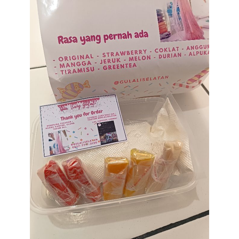 Terdiri dari 5 pcs gulali + tepung. Bisa mix rasa, silahkan tulis di note.