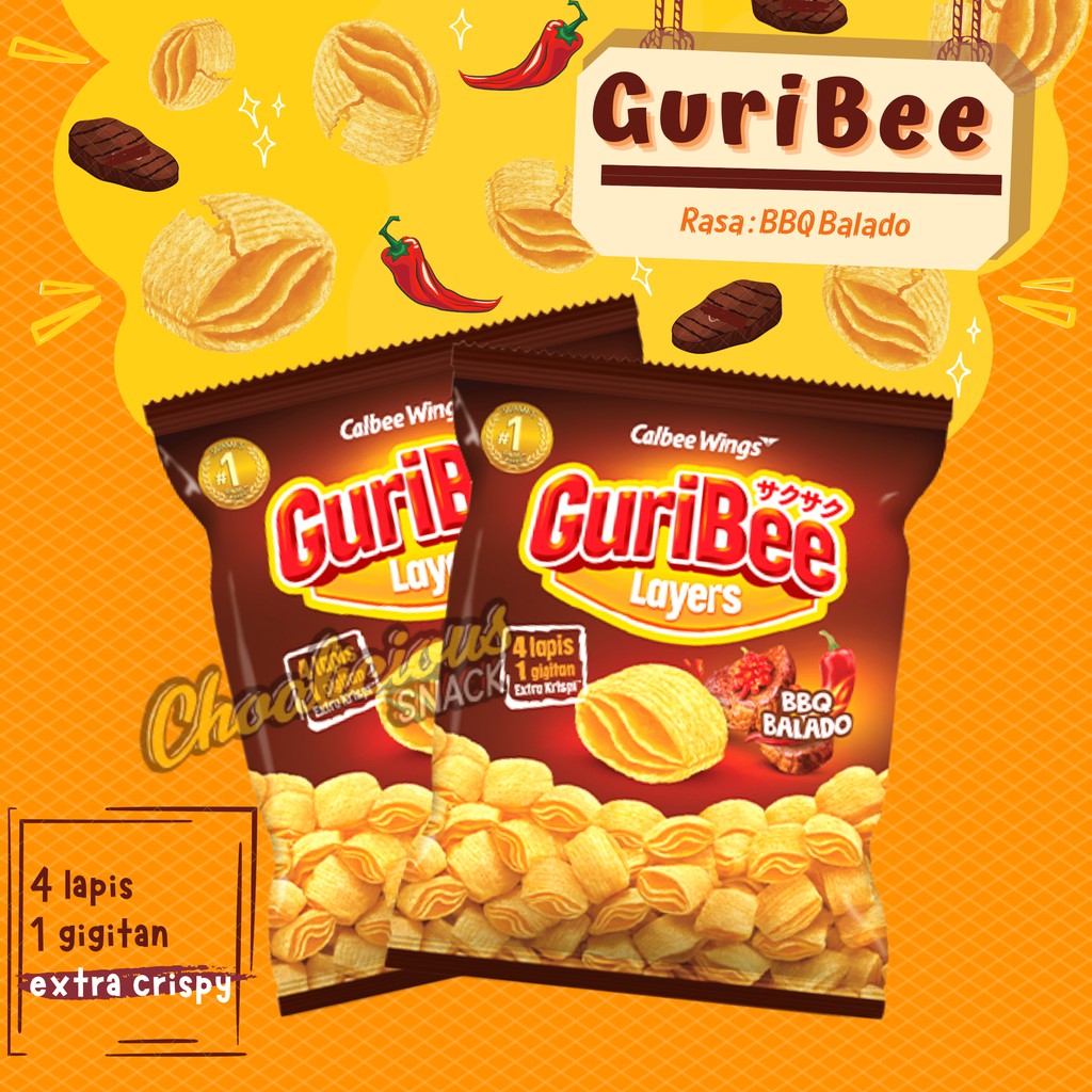 #SobatChoa! Ada snack baru nih dari Calbe Wings! GURIBEE Layers Rasa BBQ Balado! Kenapa dibilang layers? Karena dalam 1 gigitan kalian bisa langsung ngerasain 4 lapis lho! Gurihnya berlapis-lapis! Bisa bayangin dong gimana krispinya?! Udah gitu, sensasi rasa BBQ yang gurih dan pedas manis balado yang nendang bikin kamu gak bakal berhenti ngunyah! Jamin deh!