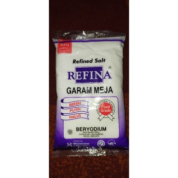 Garam meja merk REFINA, beryodium, bersih, putih, halus, ukuran 500 gram.