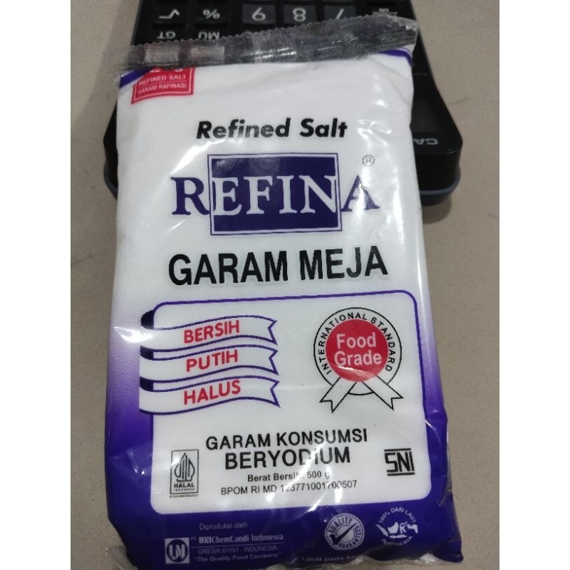 Garam meja Refina bersih, putih, halus. Refina adalah garam konsumsi hasil teknologi pemurnian dengan standar internasional. Diproses secara kristalisasi dengan menggunakan mesin berteknologi tinggi. Sehat untuk dikonsumsi karena lebih sedikit kotoran atau cemarannya.
