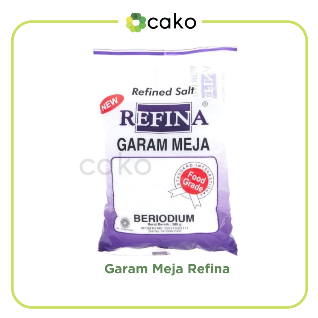 Garam Meja Refina 250gr, Refina garam meja murni halus beryodium 100% dari laut Indonesia hasil teknologi pemurnian berstandar international. Diproses secara kristalisasi dengan menggunakan mesin berteknologi tinggi. Sehat untuk dikonsumsi karena lebih sedikit kotoran dan cemarannya.