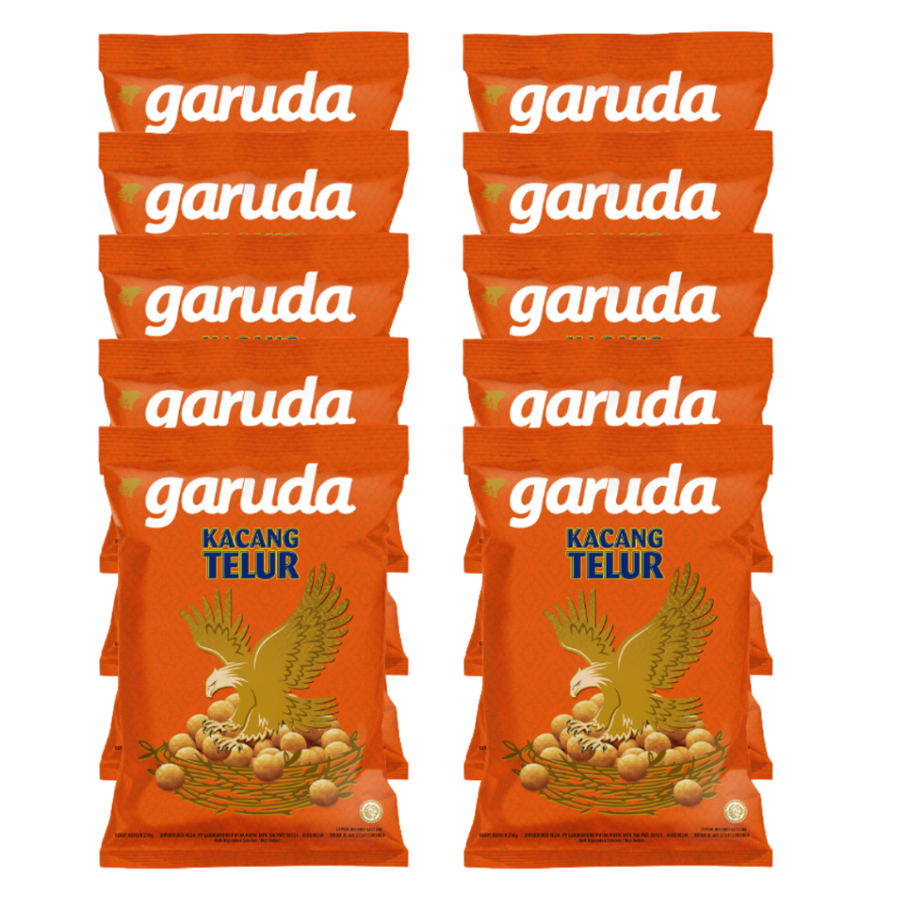 Snack kacang telur terbuat dari kacang tanah pilihan yang garing dan padat dibalut oleh tepung dari telur dan bahan-bahan berkualitas lainnya. Lemak tak jenuh dalam kacang telur Garuda dapat mengurangi risiko jantung coroner rasa kacangnya yang gurih manis dan tekturnya yang garing akan menjadikannya pilihan yang tepat untuk meramaikan suasana berkumpul Anda.