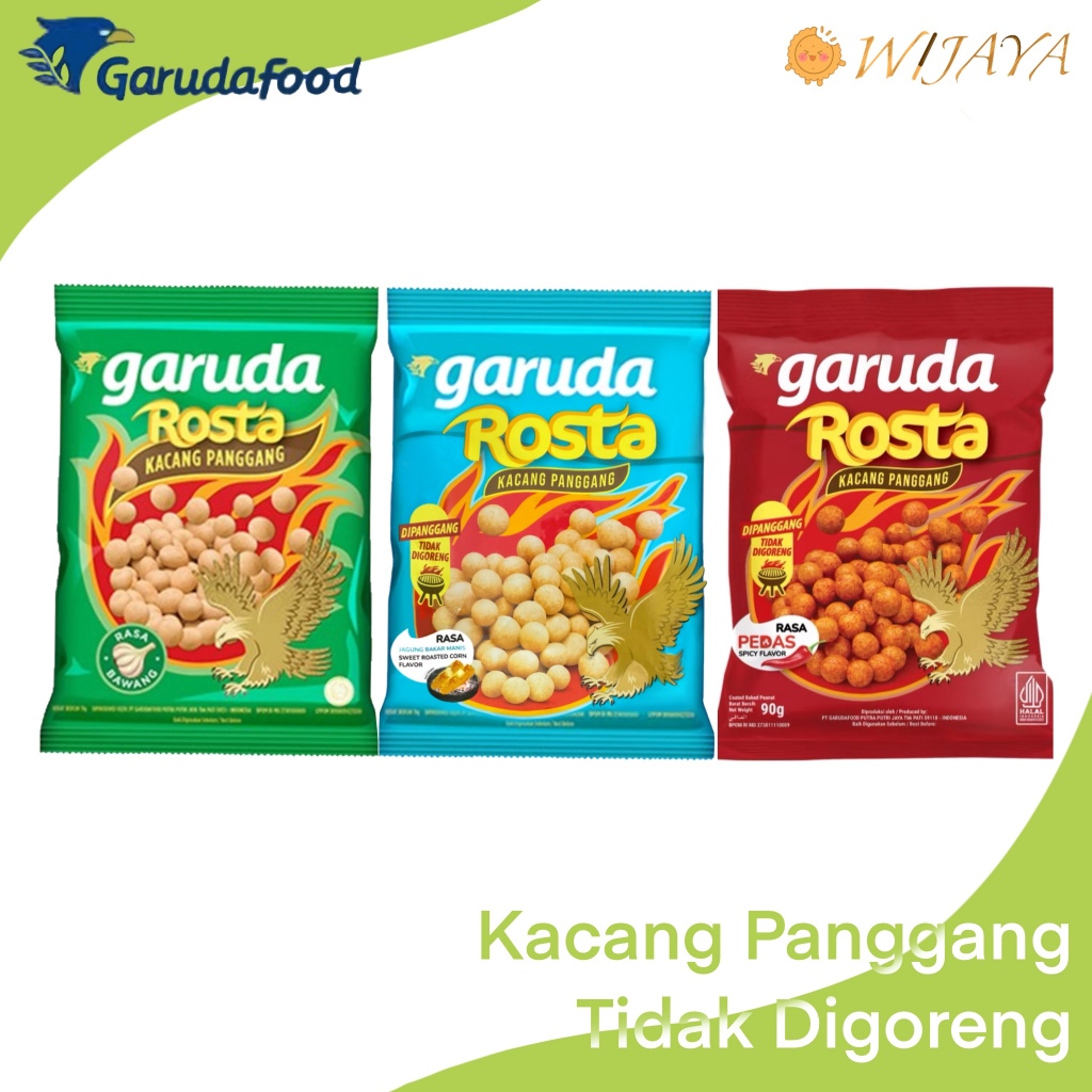 Garuda Rosta Kacang Oven dihasilkan dari kacang tanah pilihan yang garing dan padat, serta dibalut oleh tepung terigu dan dipanggang dengan minyak nabati yang sehat, tidak digoreng sehingga memiliki kandungan yang kaya akan lemak tak jenuh, sehingga dapat mengurangi risiko jantung koroner pada hidup Anda, sangat cocok dinikmati saat santai bersama teman, sahabat, dan keluarga. Dijual per bungkus bernetto 95 gram. Ber BPOM dan Halal MUI.