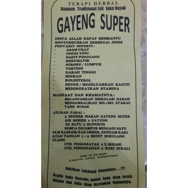 Halo! Saya menjual obat herbal ramuan tradisional asli suku Dayak "Gayeng Super". Mempunyai manfaat memancarkan sirkulasi darah dan dapat mengembalikan sel saraf yang rusak. Obat ini dapat membantu menyembuhkan penyakit: asam urat, kolesterol, vertigo, pegal Linu, darah tinggi, lumpuh, stroke, rematik, dll. Insyaallah aman karena terbuat dari bahan alami