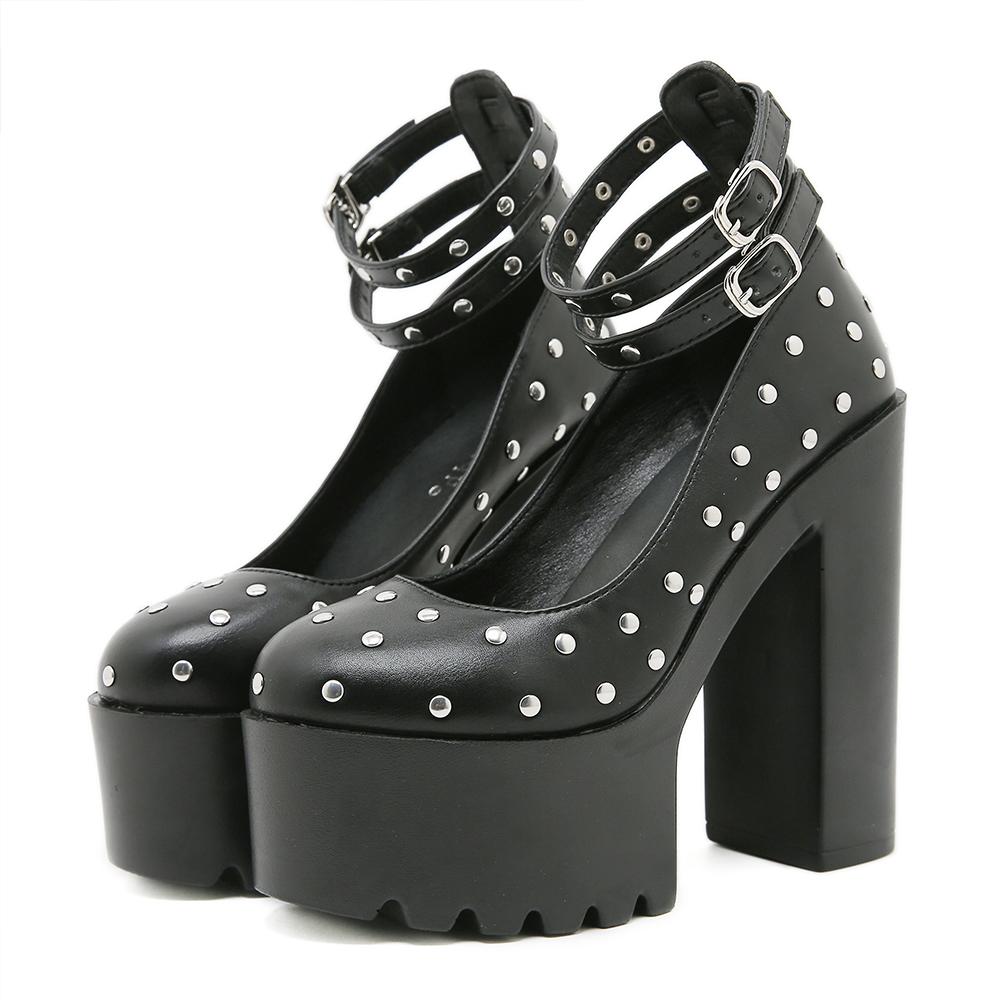 Gdgydh Ретро Панк Стиль Туфли на Платформе для Женщин Отделка Шипами Ремешок с Пряжкой на Щиколотке Массивный Каблук Туфли для Платья Удобные Высокие Каблуки 39 чёрный
