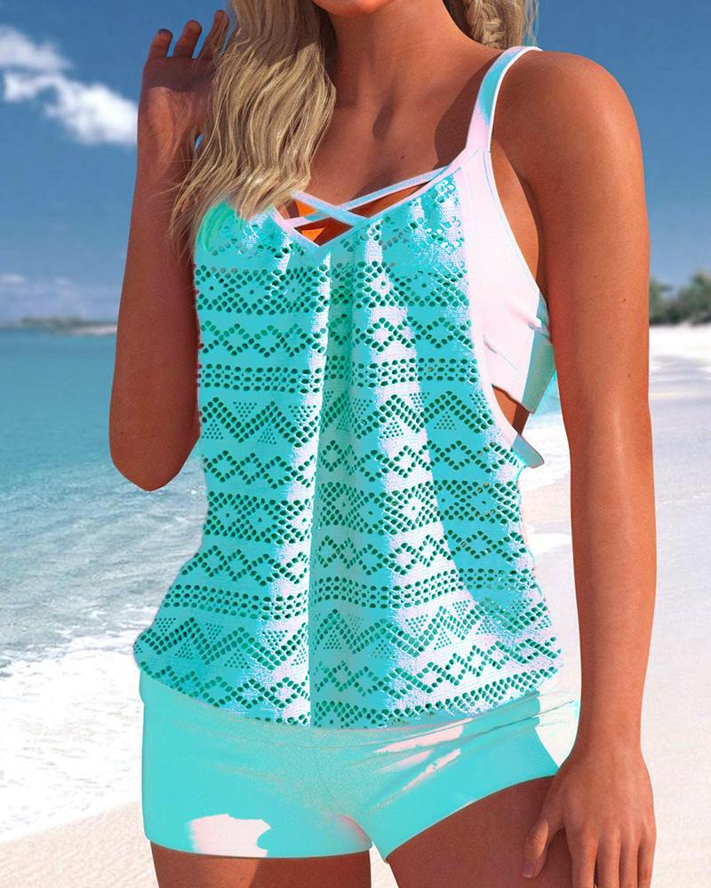 Geometric Hollow Out Crisscross Front Lace Tankini Set, Blue