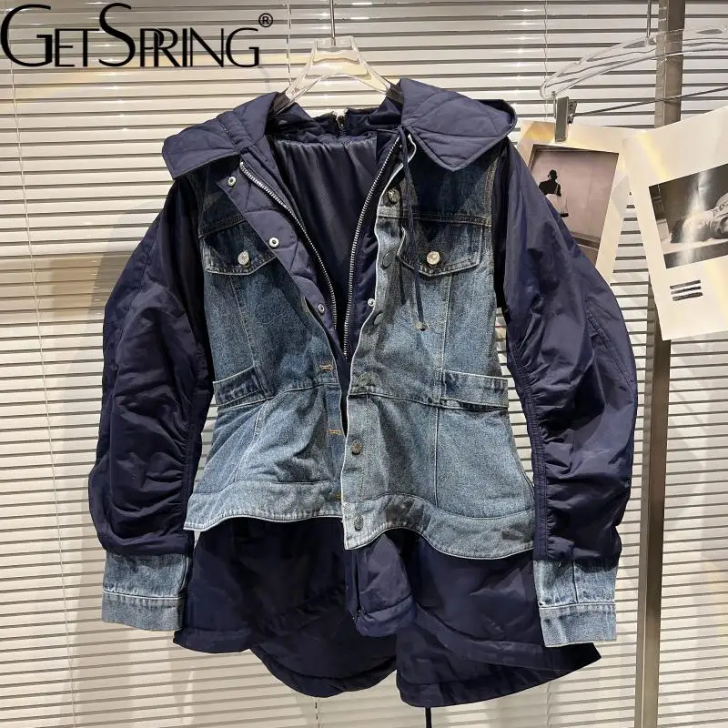 GetSpring Женская Стеганая куртка, джинсовая простроченная утепленная женская куртка с капюшоном, модная Свободная Повседневная Длинная женск...
