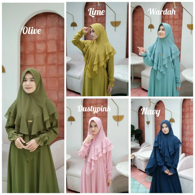 Ghania set di design simple namun tetap elegant , looknya yg terlihat cantik dan memberikan efek slim untuk muslimah yg memakainya