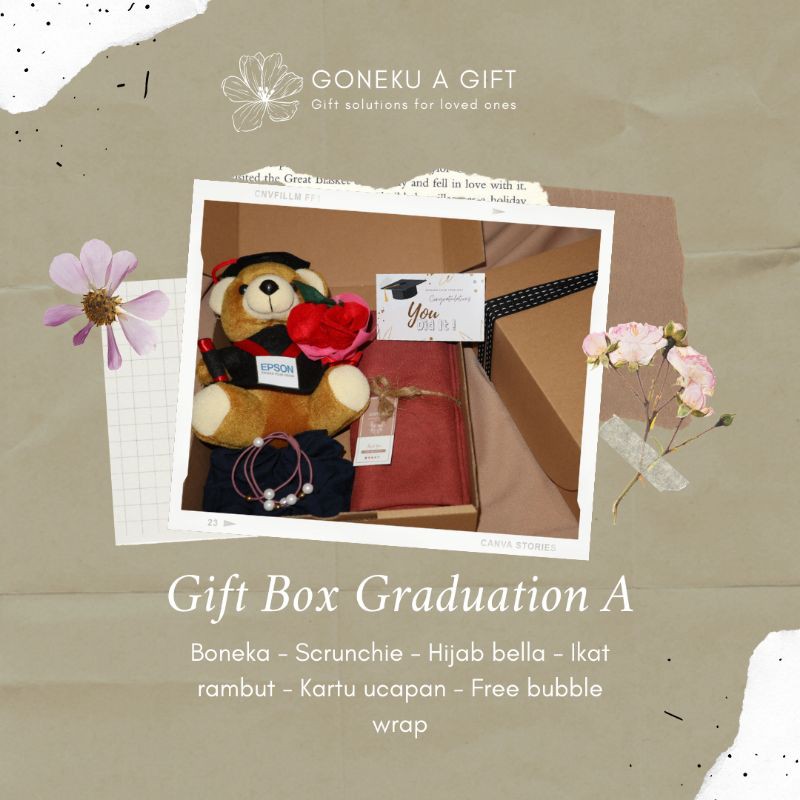 • ISI GIFT BOX GRADUATION A : 1 BONEKA,1 SCRUNCHIE, 1 HIJAB BELLA SQUARE, 1 IKAT RAMBUT, FREE KARTU UCAPAN DAN BUBBLE WRAP