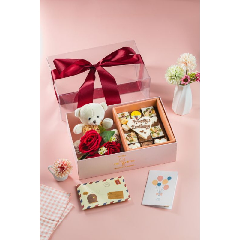 Gifset ini hadir dalam kemasan yang elegan dan di tutup dengan mika bening berhias pita, yang di isi dengan satu boneka teddy bear SNI dan 3 bunga mawar estetis dan satu box brownies 12 pcs.