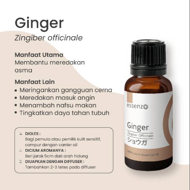 Ginger oil berasal dari bagian Rhizoma (rimpang) segar dari tanaman jahe – yaitu tangkai bagian bawah yang biasanya menyembul keluar dari akar. Ginger yang seringkali ditemukan dalam masakan-masakan Asia memiliki citarasa pedas, hangat, dan harum ketika digunakan sebagai bumbu masak. Apabila dikonsumsi secara internal, Ginger dapat membantu kesehatan pencernaan dan menghilangkan mual-mual.* Minyak esensial Ginger juga dapat digunakan secara topikal atau dihirup untuk mendapatkan efek menenangkan.