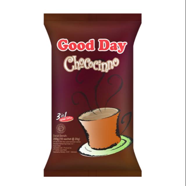 Good Day Chococinno merupakan kopi instan yang terbuat dari perpaduan kopi, gula, dan krimer dalam satu saset. Rasa Chococinno yang istimewa sangat pas dinikmati dalam setiap momen hangatmu bersama teman atau orang kesayangan. Kemasannya yang praktis memudahkan Anda untuk membawanya kemanapun Anda berada.