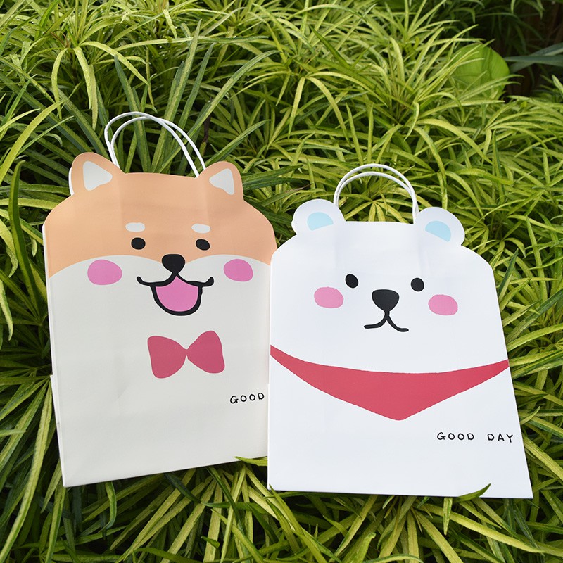 Kantong kertas dekoratif bertema karakter beruang putih yang lucu dan shiba inu yang menggemaskan. Dengan ukuran yang lumayan besar, cocok untuk menyimpan apa saja. Gunakan untuk memberikan bingkisan/kado atau sekedar pengganti kantong biasa. Bahan kantong terbuat dari kertas karton tebal dan dilengkapi tali kertas yang tidak mudah koyak.