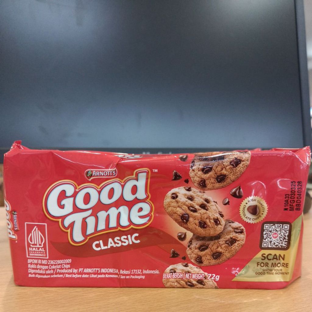 Good Time Classic adalah biskuit coklat renyah dengan taburan chocolate chips yang terkenal dengan rasa klasik dan lezatnya. Biskuit ini cocok dinikmati sebagai camilan santai atau teman minum kopi.