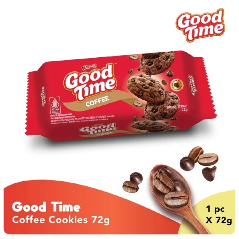 Good Time Coffee Cookies 72gr. Paket Spesial dengan biskuit chocolate chips rasa kopi renyah bertabur chocochip yang melimpah disetiap gigitannya. Simply loved by everyone.