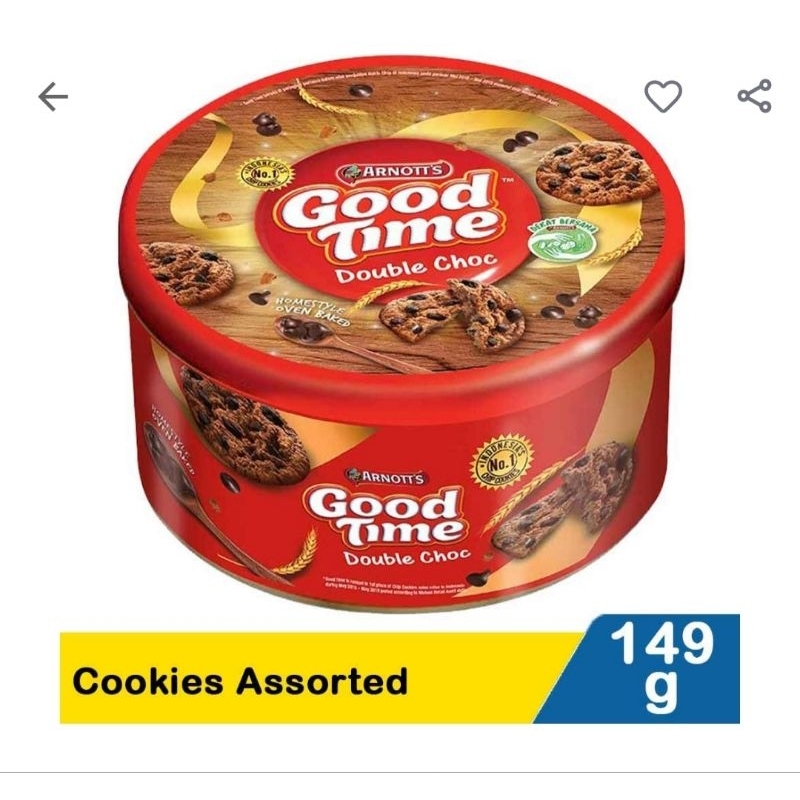 Good Time Cookies Assorted 149g adalah paket berbagai varian Good Time Cookies dalam satu kaleng. Kerenyahan kue kering yang berkualitas ditambah dengan taburan choco chips rasa coklat yang pekat akan memberikan pengalaman makan yang istimewa untuk Anda dan keluarga. Beragamnya pilihan varian kue kering dengan choco cips lezat dalam satu kaleng Good Time Cookies Assorted menjadikannya pilihan yang tepat dalam berbagai kesempatan. Kue cookies ini juga dapat menjadi teman minum kopi, teh, dan susu kesukaan Anda. Pilih sendiri varian kesukaan Anda dan warnai hari-hari dengan Good Time Cookies Assorted.