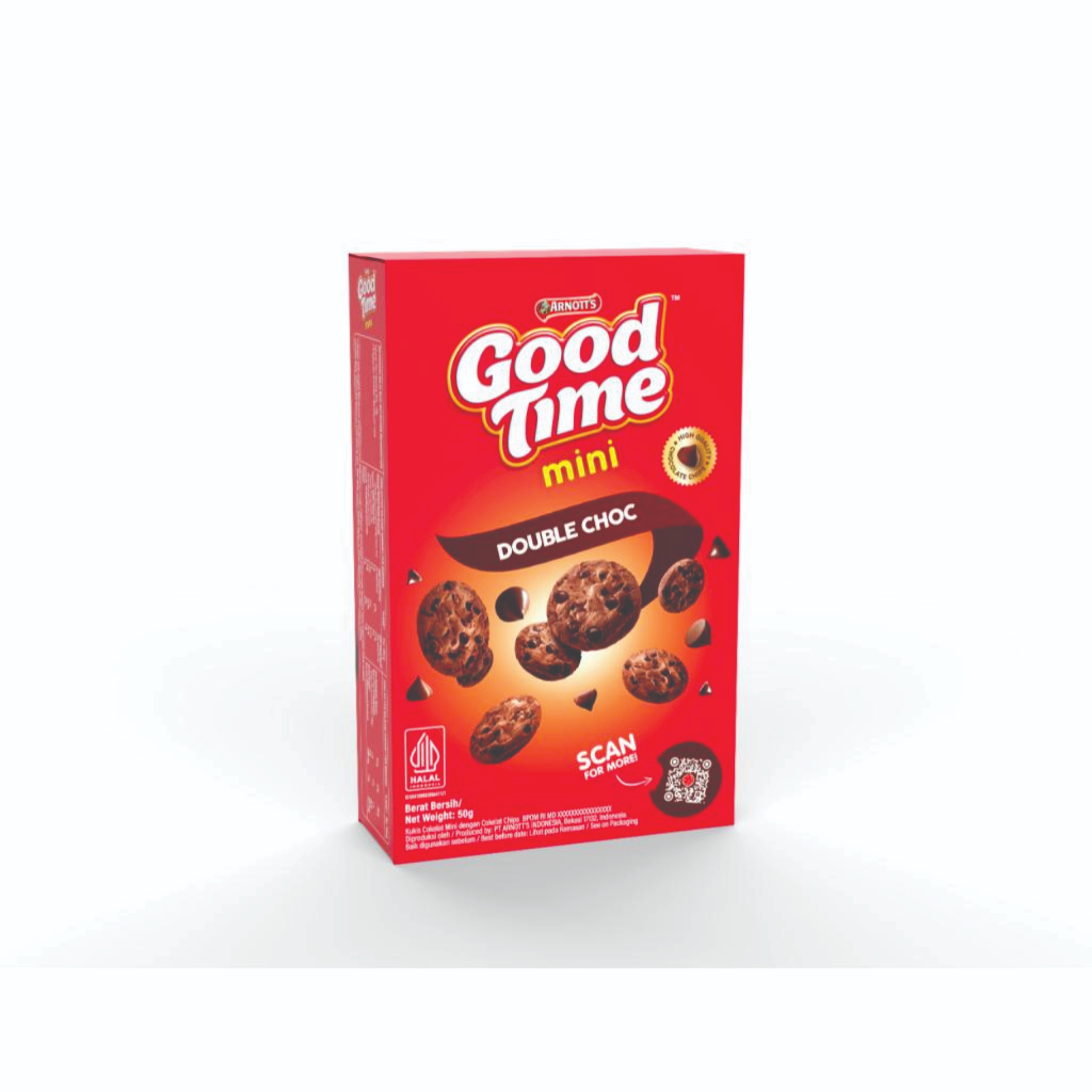Good Time Mini Box 50gr dengan kemasan praktis dan siap dibawa kemana saja. Satu kemasan yang praktis berisi 25 keping Good Time cookies. Dengan rasa coklat yang nikmat Good Time, semakin nikmat untuk dinikmati saat istirahat sekolah, saat bersama teman-teman ataupun untuk bekal bepergian