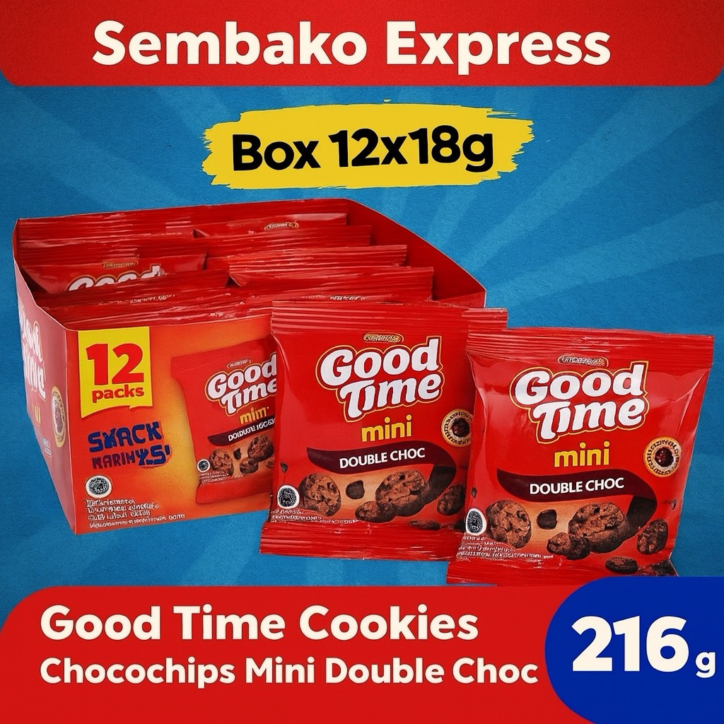Good Time Mini Double Choc hadir dengan rasa cokelat ganda yang lumer di mulut. Dalam satu box isi 12 bungkus @18g, kamu bisa nikmati cookies renyah dengan chocochips melimpah kapan saja!