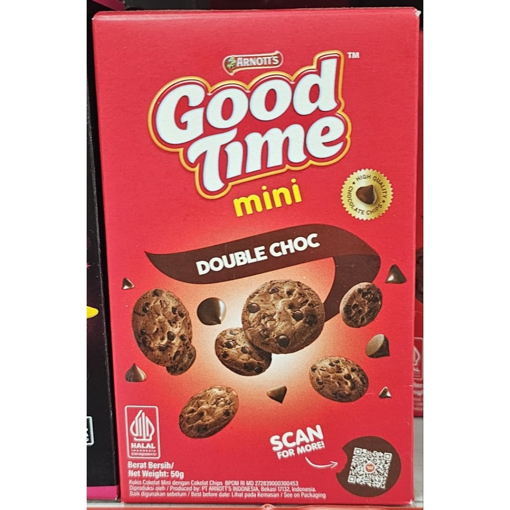 Good Time Double Choco 50g adalah biskuit coklat renyah dengan potongan coklat (chocochips) di dalamnya, dikemas dalam ukuran mini 50 gram yang praktis untuk dibawa bepergian atau dinikmati kapan saja. Biskuit ini memiliki rasa coklat yang kaya dan tekstur yang renyah.