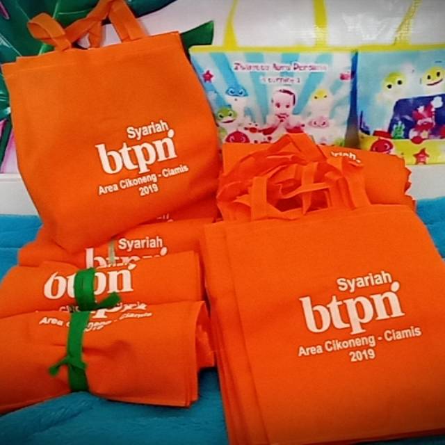 Bahan spundbond 50gram. Warna dan sablon bisa request. Pengerjaan paling cepat 1 minggu.