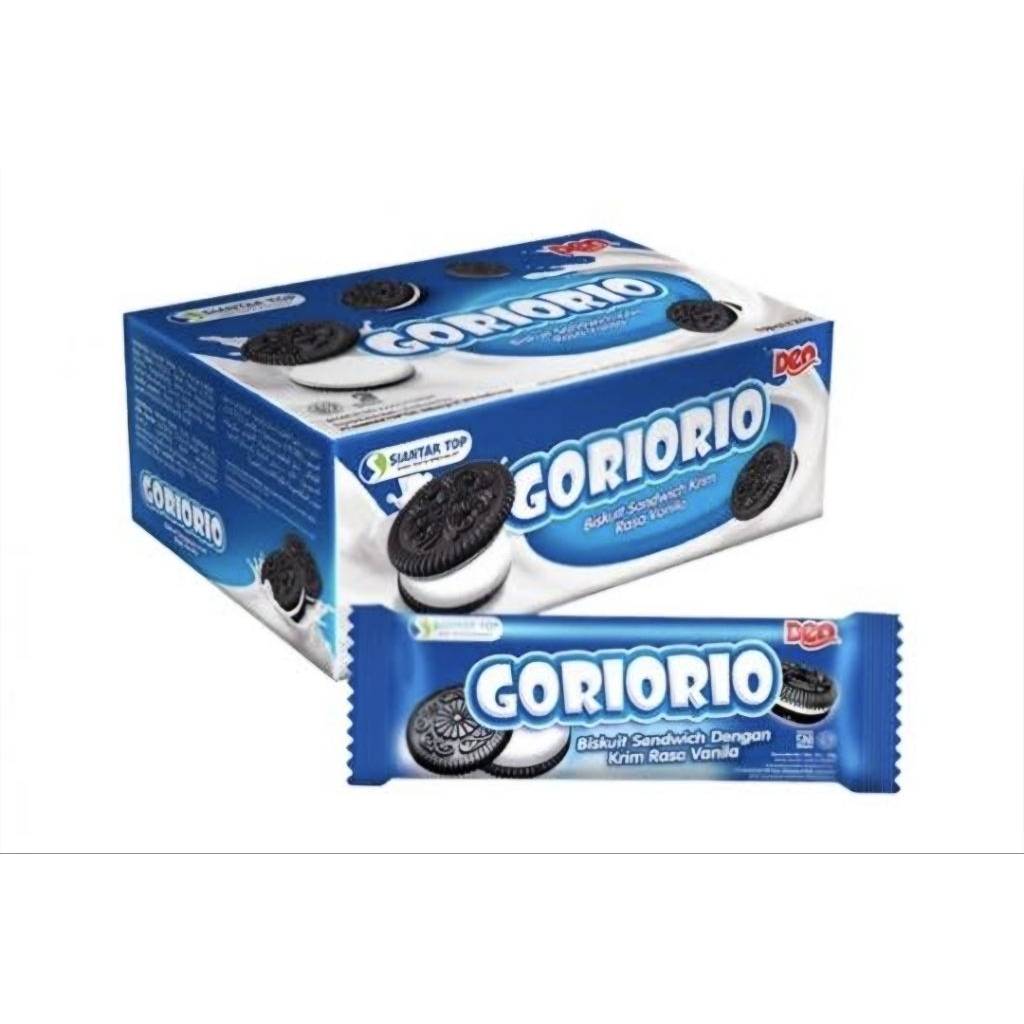 Biskuit dengan teksturnya yang renyah dan krim yang mengisi di tengahnya. Goriorio tersedia dalam rasa, seperti coklat dan vanila. isi 10 packs