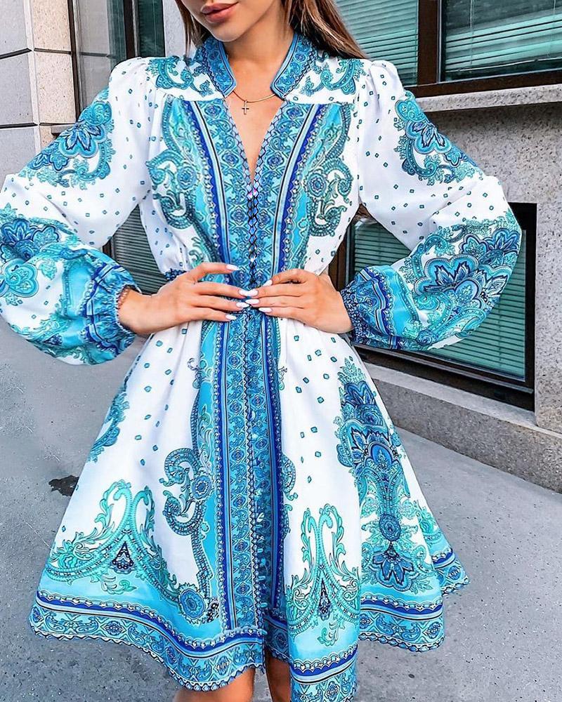 Graphic Print Lantern Sleeve Button Front Dress, Blue