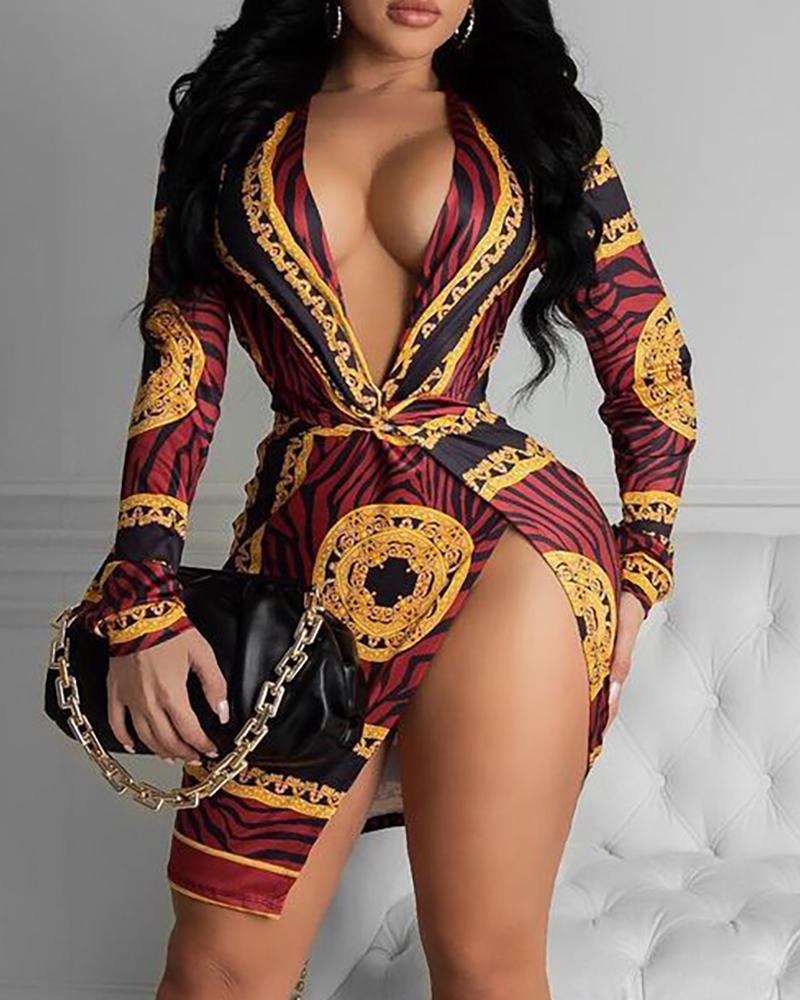 Graphic Print Plunge High Slit Bodycon Dress, Brown