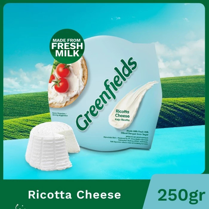 Greenfields Ricotta Cheese! Berasal dari susu segar di peternakan Greenfields sendiri. Mempunyai tekstur lembut dengan rasa segar, creamy, dan ringan untuk melengkapi berbagai masakan Italia seperti pasta, lasagna dan cheesecakes. Tinggi protein, cocok untuk yang ingin diet atau ingin membentuk otot.