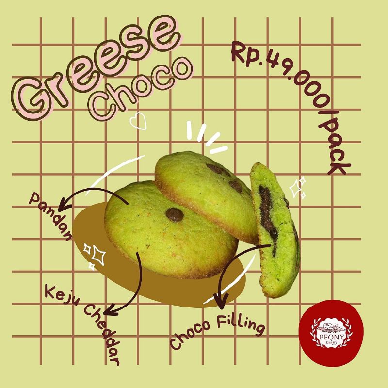 Cookies series (II) terbaru kami "Greese Choco", cookies rasa pandan yang di padu dengan keju cheddar dan filling coklat yang lembut.