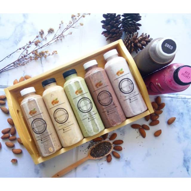 Susu Almond terbuat dari 100% ALMOND USA dengan perpaduan Rolled Oat, himalayan salt, Flaxseed, dan Chia seed.