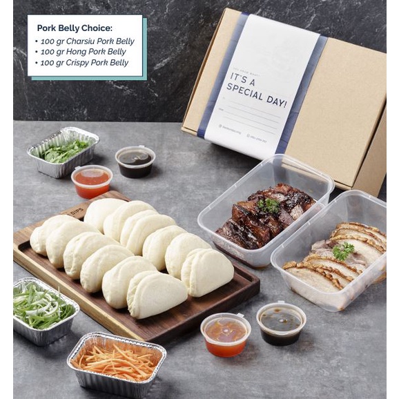 2 macam olahan Samcan babi @200gr (opsi: Crispy Pork/Charsiu/Hong) disajikan dengan Roti Guabao (12pcs) dan dihidangkan dengan irisan daun bawang, wortel, dan ketumbar, dan beberapa cocolan saos.