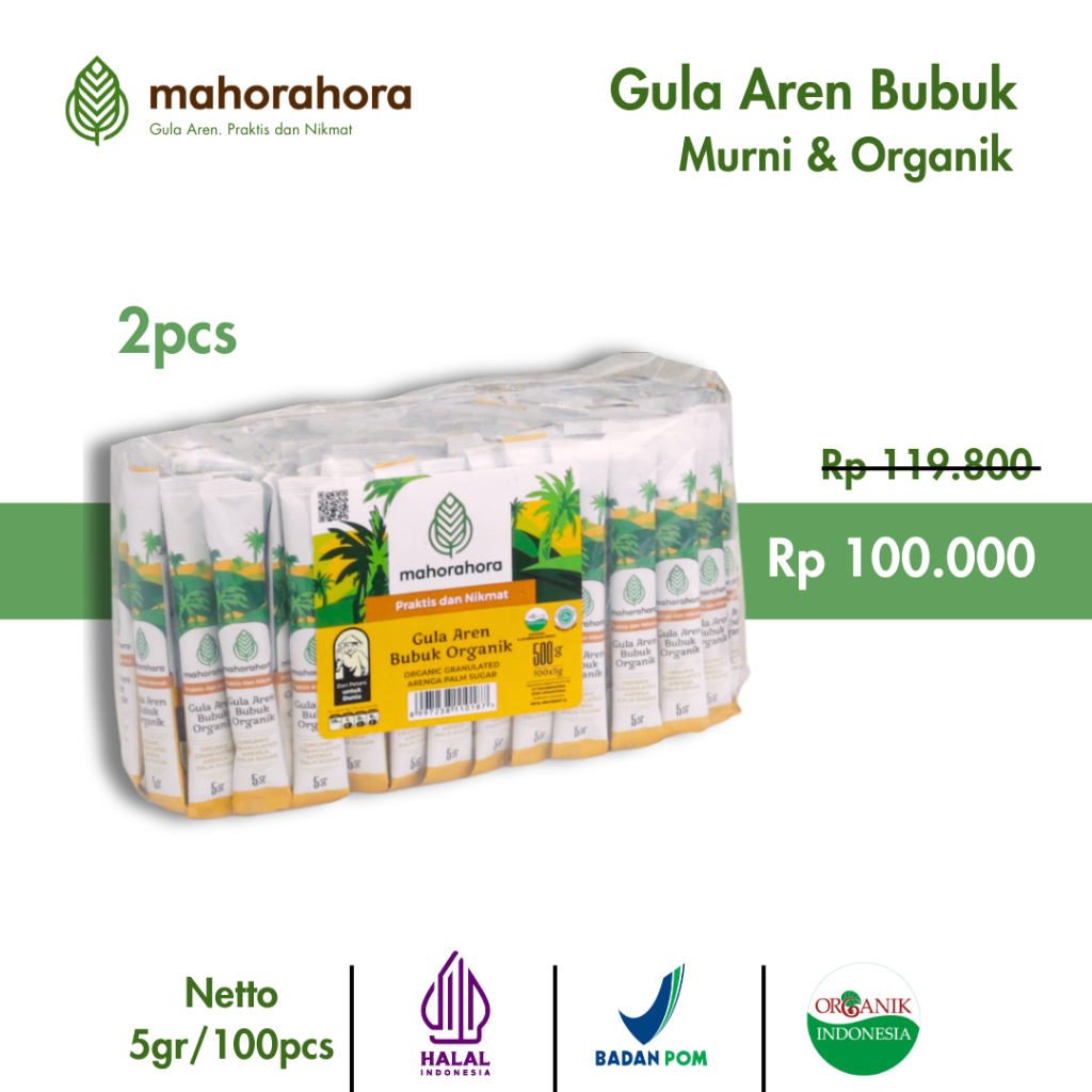 Mahorahora Gula Aren/Palm Sugar/Gula Semut Organik Bubuk Sachet 100 Pcs, Premium Rendah Kalori, Sertifikasi Organik Indonesia