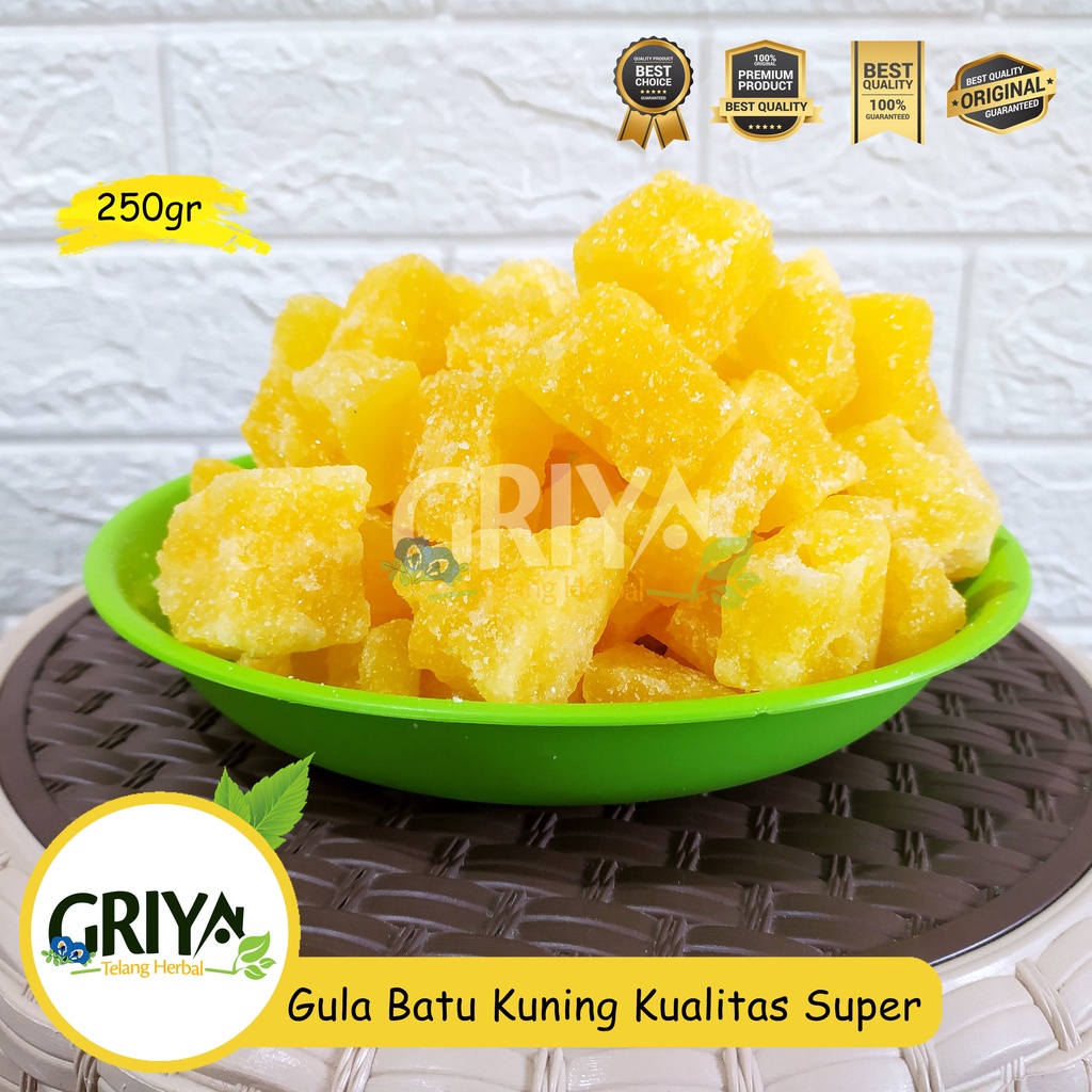 Ready stok gula batu kuning kemasan 250gr. Gula batu merupakan olahan tebu yang dikristalkan, melalui bantuan air yang dipanaskan hingga mencapai kondisi jenuh lalu menjadi dingin