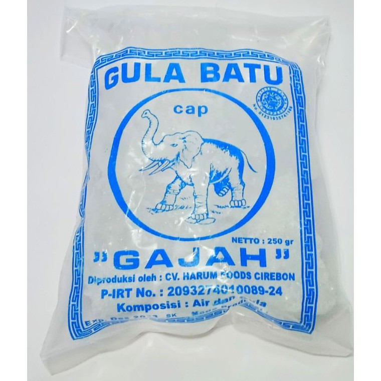 Gula batu CAP GAJAH merupakan sari tebu murni asli Cirebon. Berat bersih 250 gram per pcs. Minimal order 1 pcs atau 4 pcs / 1 kg dan jika mau order diatas 4 pcs maka harus order kelipatannya (8 pcs, 12 pcs dan seterusnya).