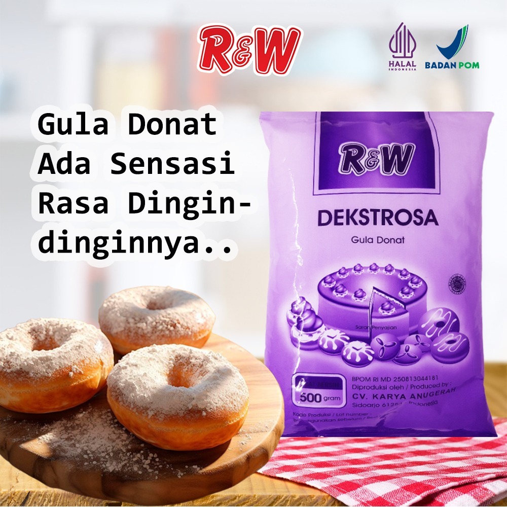 Dekstrosa (Gula Donat) merk R&W terbuat dari bahan baku pilihan dan di produksi secara tepat sehingga memberikan hasil yang baik bagi produk anda. Dextrose adalah gula dingin atau gula halus yang biasa digunakan sebagai topping donut, putri salju, dll. Bisa juga dipakai untuk campuran dengan gula halus untuk memberikan rasa yang lebih manis, karena gula salju mempunyai rasa manis yang kurang dan memiliki sensasi dingin.