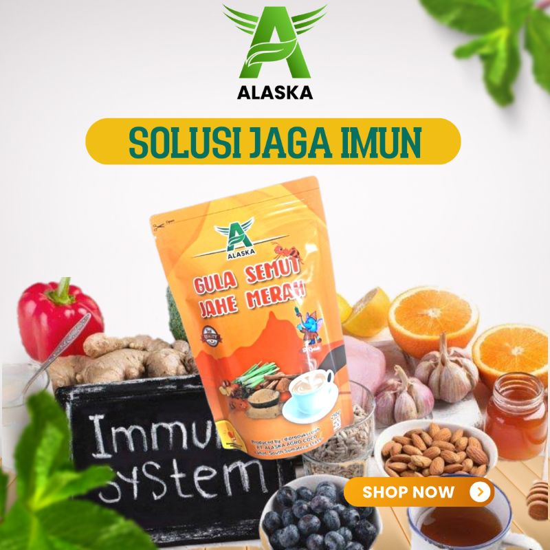 gula semut jahe merah Alaska, dibuat dari gula aren pilihan dan jahe merah segar berkualitas,
