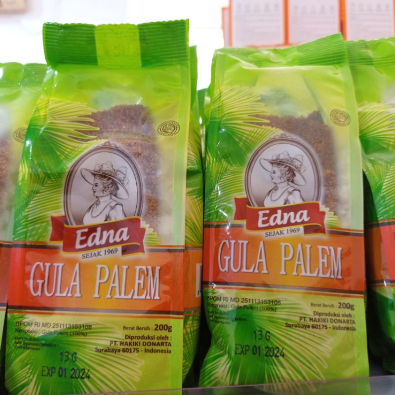 Edna gula palem kemasan 200gr, Edna Gula Palem adalah gula palem yang biasa disebut juga dengan gula semut. Gula palem ini berasal dari nira / sari batang bunga pohon aren, memiliki bentuk butiran seperti pasir yang halus dan berwarna coklat.