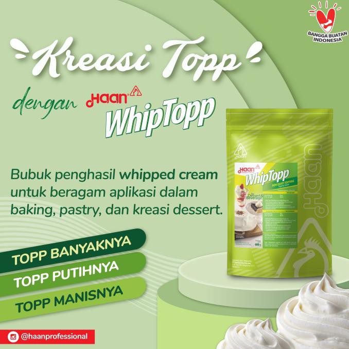 Haan WhipTopp merupakan topping bubuk penghasil whipped cream yang diformulasikan khusus menyesuaikan kebutuhan di kalangan food service.