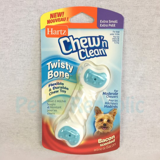 DescriptionHelp protect your pup’s dental health with Hartz Chew 'n Clean Twisty Bone Bacon Scented Flexible Dog Chew Toy. This toy has twisty middle ridges that offer a firm grip and help massage gums. The nubby textured ends entice chewing and are enriched with a tempting bacon scent to keep your furry friend interested. Hartz Chew 'n Clean Twisty Bone Bacon Scented Flexible Chew Toy helps keep teeth and gums clean to reduce the build-up of plaque and tartar for most dogs--especially puppies and seniors.Key BenefitsUnique twisty design encourages chewing and assists dental health.Flexible and durable chew toy that withstands mild to moderate chewing.Great for puppies and senior dogs.Features a tempting bacon scent to entice your pup.Toy satisfies your dog’s natural urge to chew and reduces the formation of plaque and tartar.PrecautionsSupervise your pet. For play only. Not a child's toy. Toy should be removed and replaced if excessive wear or damage occurs. Always select toys appropriate for your dog's size and chewing habits.DIMENSIONS7.19 x 3.88 x 1.13 inchesBREED SIZESmall Breeds, Medium Breeds, Large Breeds