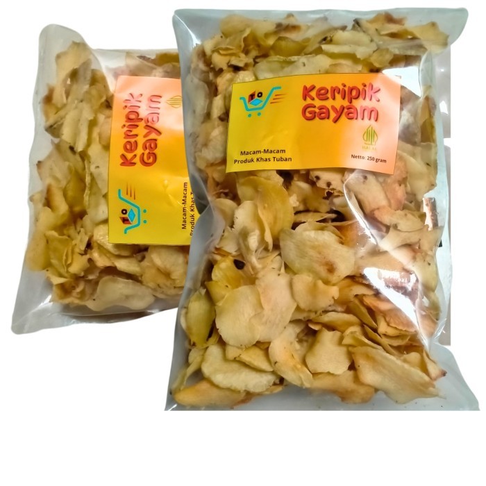 Keripik yang terbuat dari Buah gayam yang diolah secara tradisional, tanpa zat kimia dan pewarna sehingga menghasilkan rasa yang khas, renyah, gurih dan higinies.