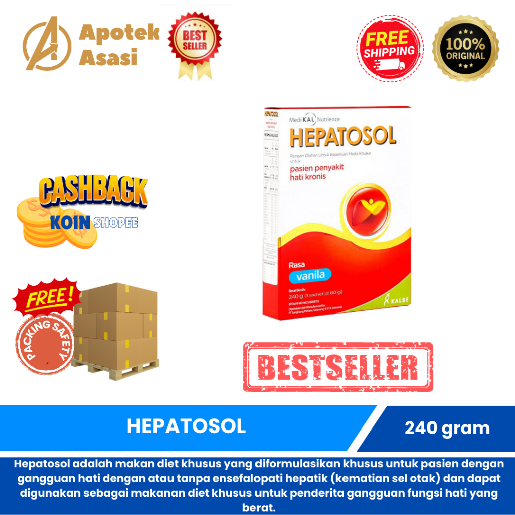 Hepatosol 240 g merupakan pangan olahan untuk keperluan medis khusus untuk pasien penyakit hati kronis. Hepatosol merupakan nutrisi yang diperkaya BCAA ( Branched Chain Amino Acid) dan lemak baik MCT ( Medium Chain Triglicerides) untuk mempercepat pemulihan hati pada kondisi penyakit kronik, perlemakan hati dan sirosis. Pemberian produk ini harus dengan rekomendasi dokter.