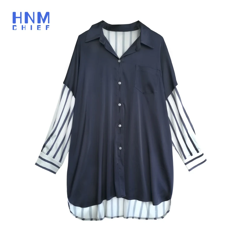 HNMCHIEF женское шелковое длинное платье для сна синяя комбинированная ночная рубашка с длинным рукавом Осенняя Шелковая пижама в полоску Пижа...