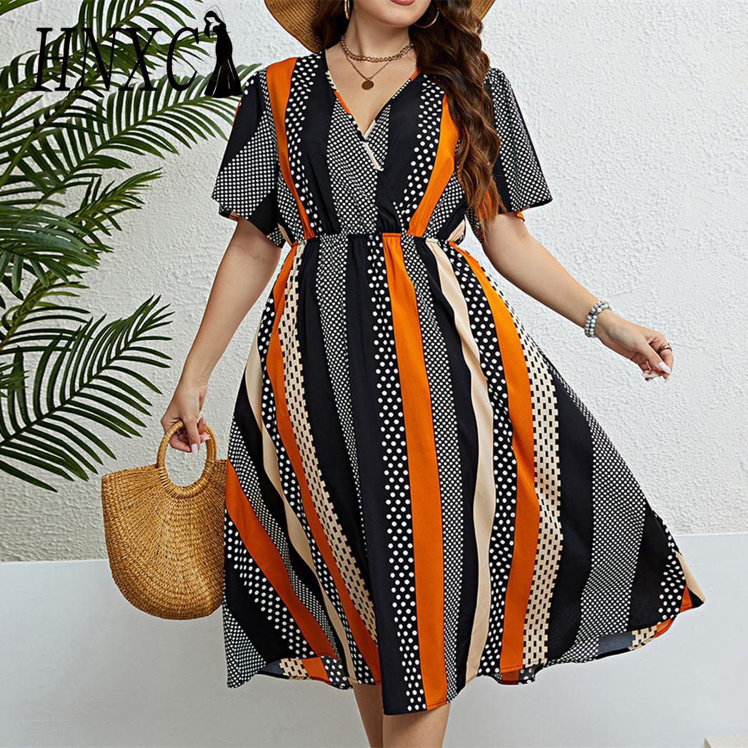 HNXC Женская мода Лето Весна в полоску с принтом с коротким рукавом и v-образным вырезом с высокой талией повседневные платья
