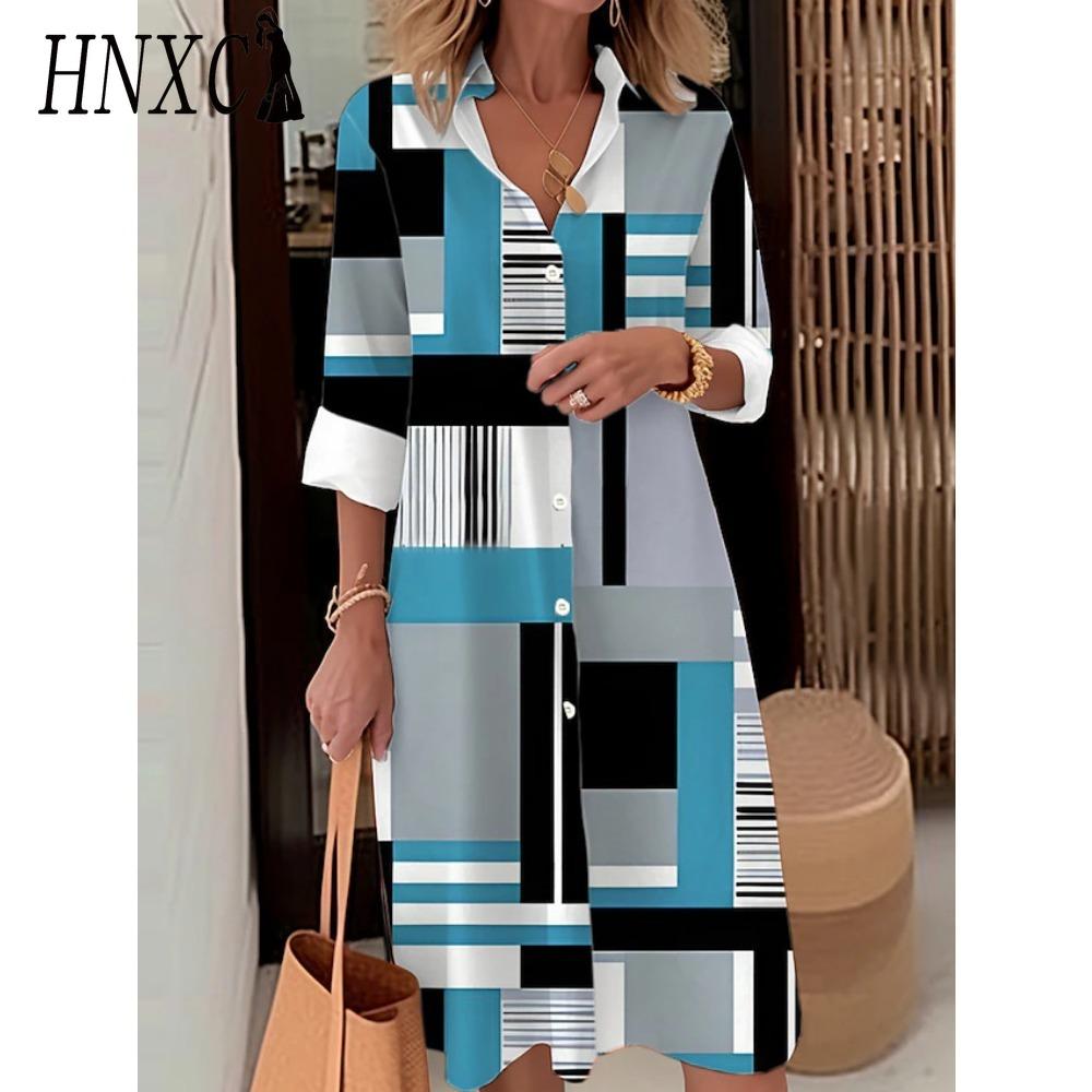 HNXC Женская мода весна-осень цветной блок принт длинный рукав воротник поло свободная талия повседневные платья XXXXL