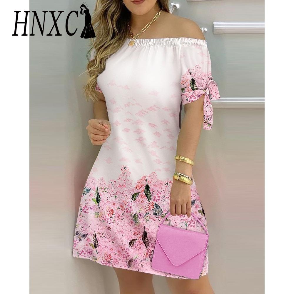 HNXC Женское модное платье с открытыми плечами, с коротким рукавом, с принтом в виде банта, летние пляжные платья больших размеров XXL