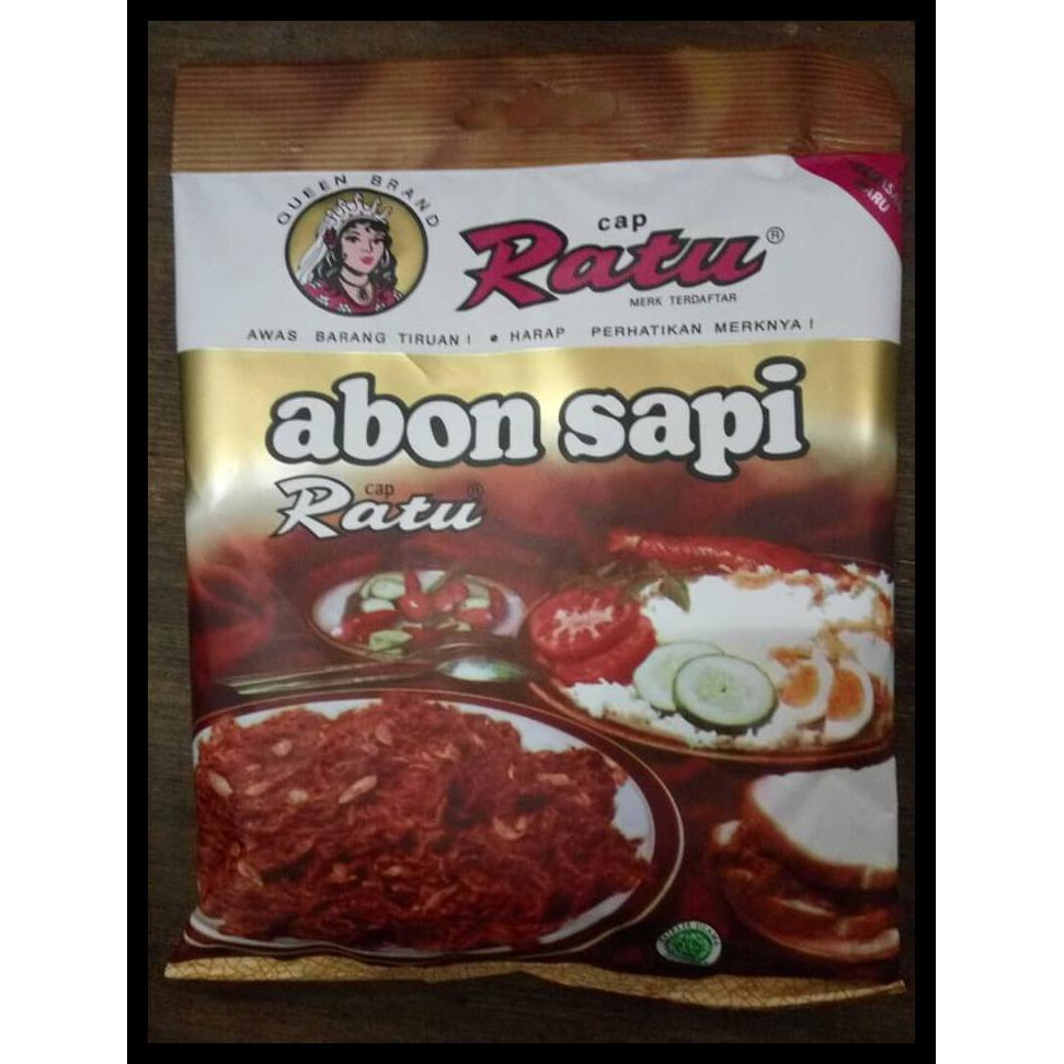 abon sapi cap ratu terbuat dari daging sapi murni dengan bumbu yang terpilih, cocok buat lauk, berat bersih 90gr